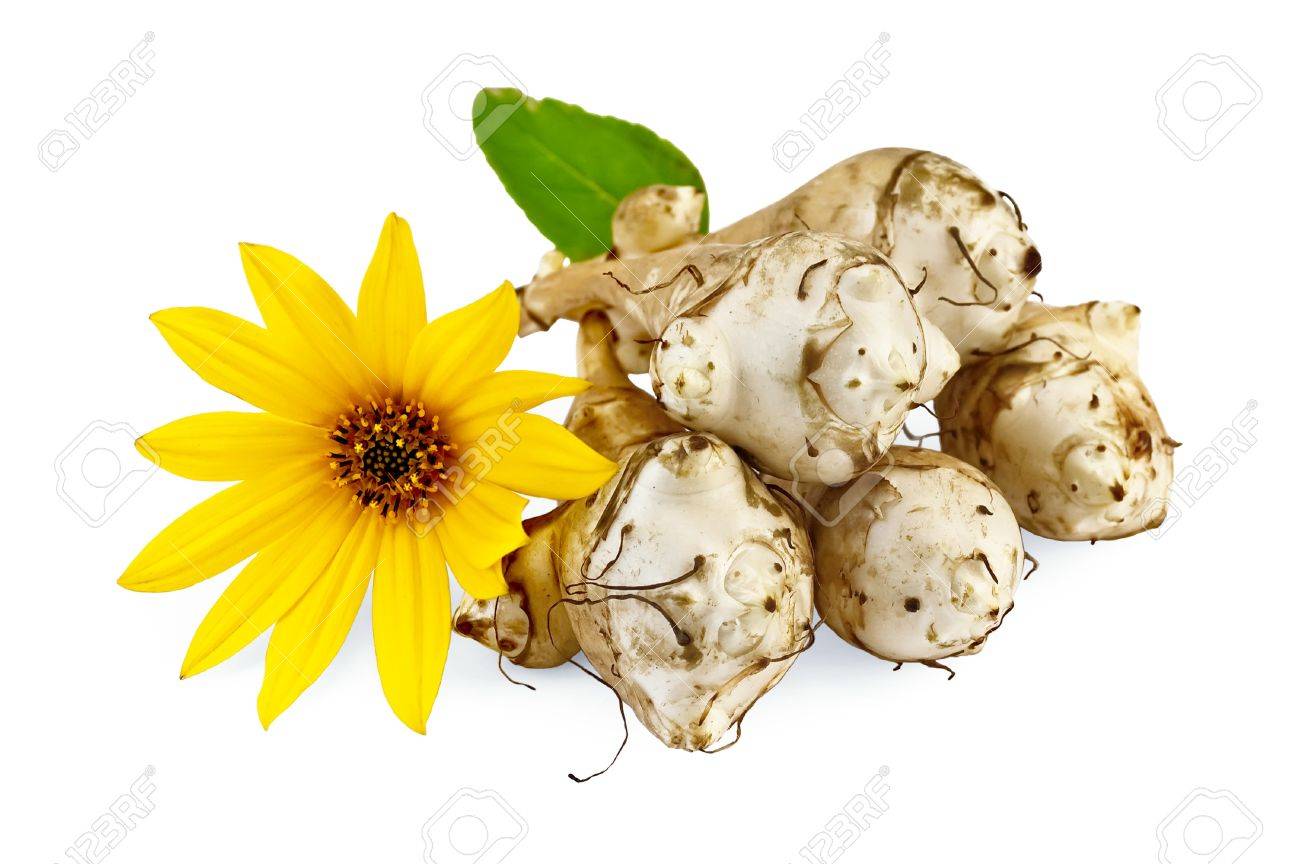 11437593-vijf-knollen-van-aardpeer-met-een-gele-bloem-geïsoleerd-op-witte-achtergrond