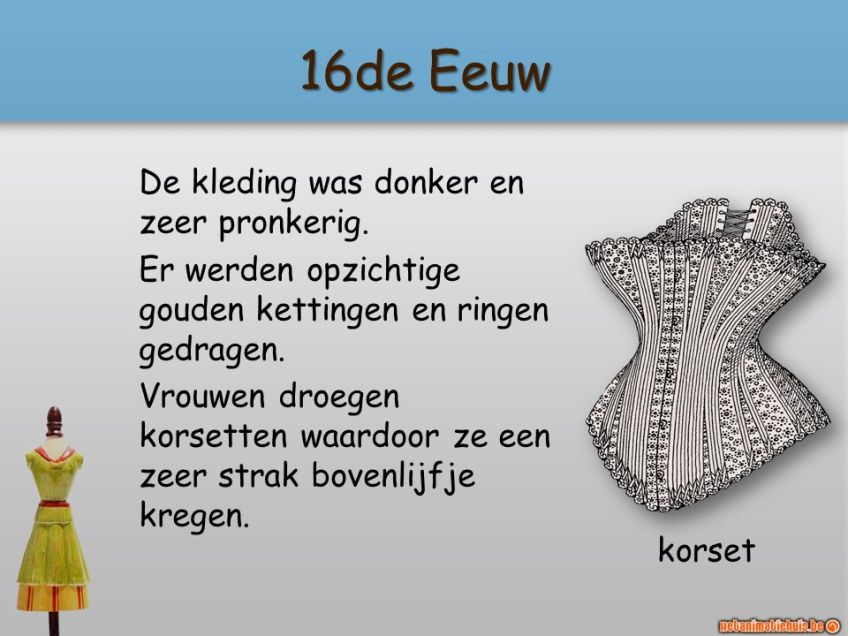 Er werden opzichtige gouden kettingen en ringen gedragen. Vrouwen droegen korsetten waardoor ze een zeer strak bovenlijfje kregen. korset.