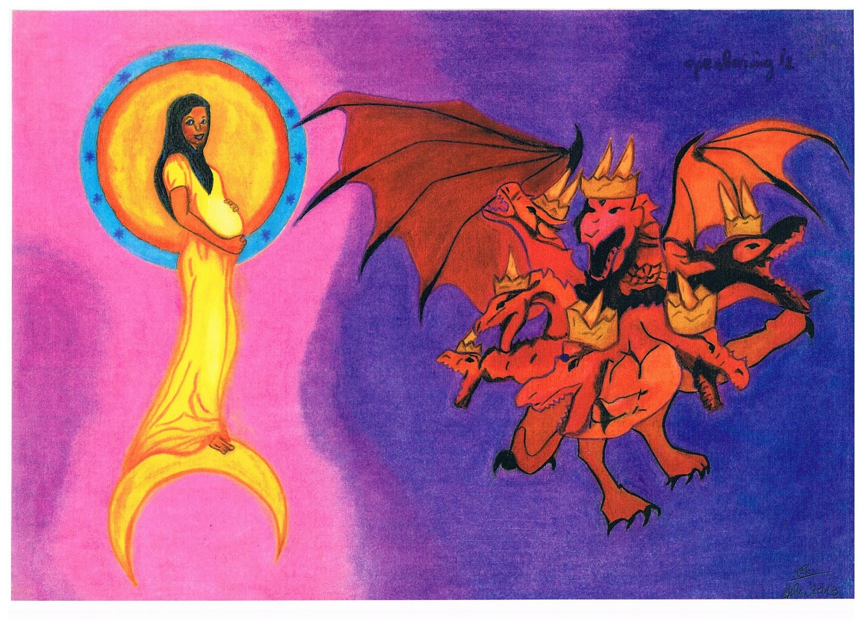 Hij staat voor de vrouw en wil het Kind verslinden. Hier wordt de oorsprong en het begin van alle antisemitisme en antizionisme onthuld. Opstand tegen de Almachtige en verzet tegen zijn plan om de wereld te verlossen. Een verlossing waarbij ‘de vrouw’, Israël, ingeschakeld wordt. In de hemel wordt de Zoon naar het hoogste ‘hemelse gewest’, naar de troon van God gebracht. Op aarde vervolgt de draak de vrouw. Deze vervolgingen van het Joodse volk duren nu al zo’n 3.500 jaar sinds de ‘geboorte’ van Israël, tijdens de uittocht uit Egypte.