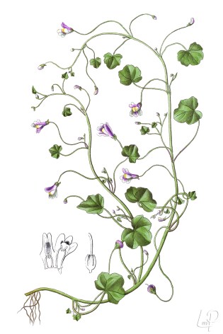 De op klimop-bladeren lijkende bladeren zijn rond-achtig, glanzend, hebben 5 tot 7 lobben en zijn aan de onderkant vaak paars aangelopen. De stengels zijn sterk vertakt en vormen op regelmatige afstand wortels.