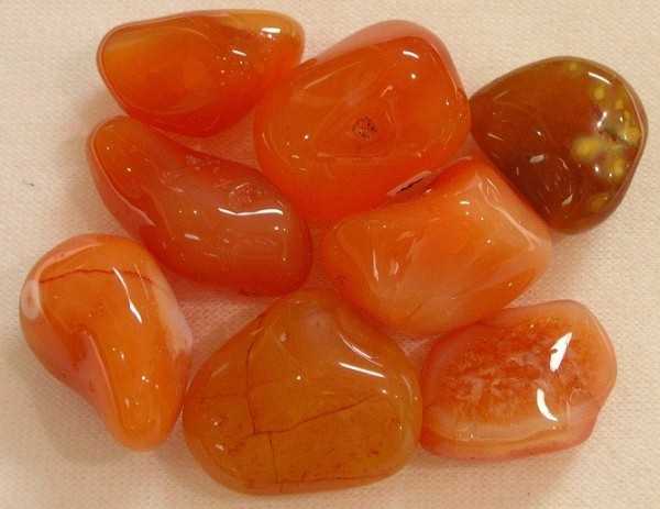 * De oranje carneool geeft – nog sterker dan de andere tinten carneool – levensvreugde en plezier, maakt luchtiger en vrolijk, geeft een gevoel van eigenwaarde.