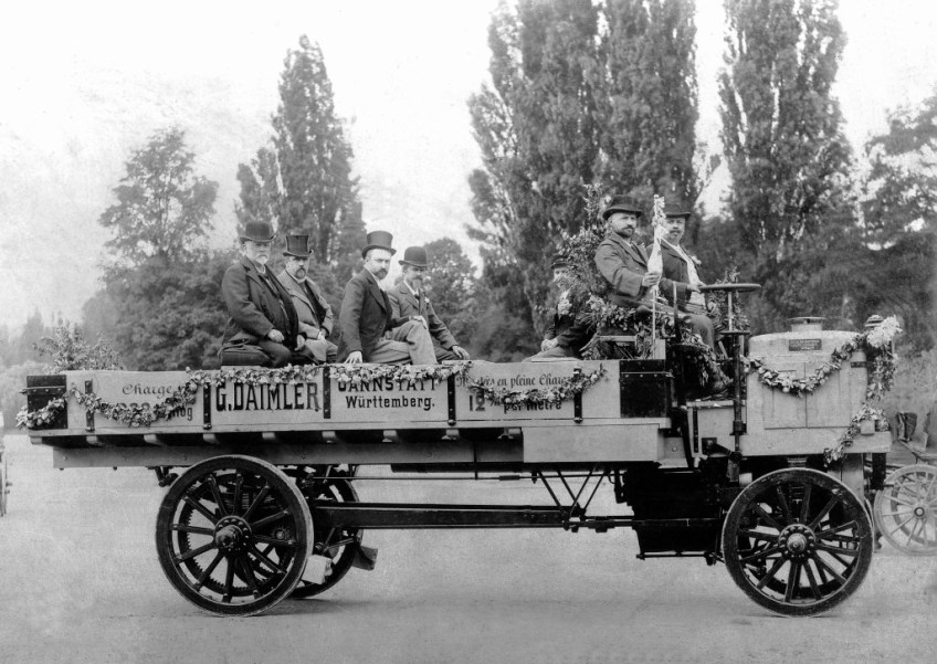 Eerste vrachtwagen Daimler ( Daimler is voorste passagier rechts )