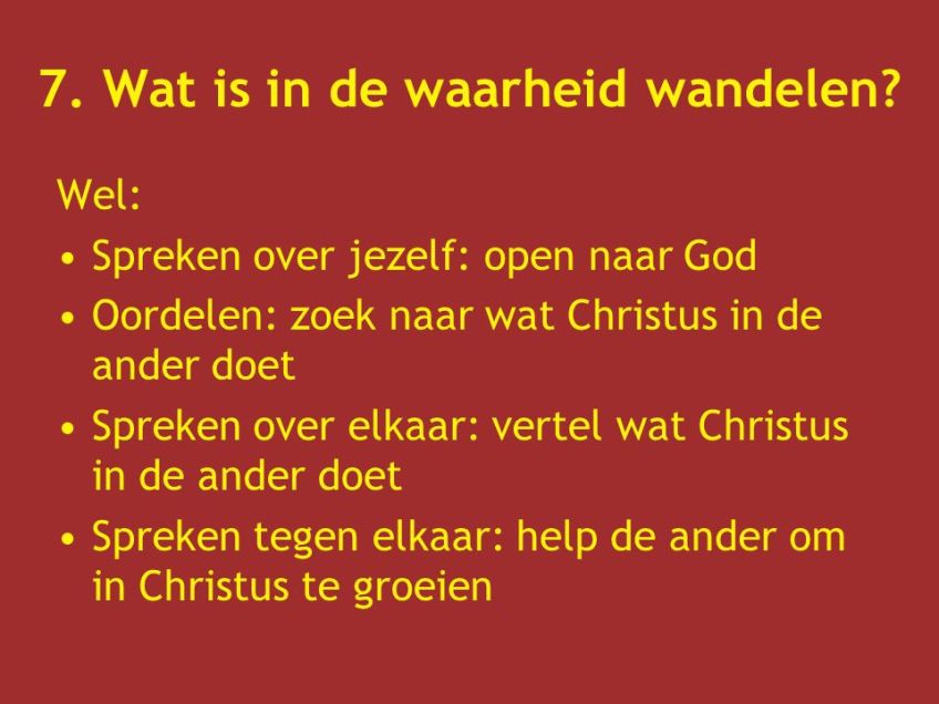 Wel: Spreken over jezelf: open naar God. Oordelen: zoek naar wat Christus in de ander doet. Spreken over elkaar: vertel wat Christus in de ander doet. Spreken tegen elkaar: help de ander om in Christus te groeien.