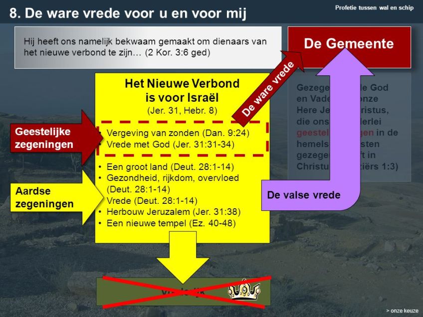 Profetie tussen wal en schip. Hij heeft ons namelijk bekwaam gemaakt om dienaars van het nieuwe verbond te zijn… (2 Kor. 3:6 ged) De Gemeente. Het Nieuwe Verbond. is voor Israël. (Jer. 31, Hebr. 8) Vergeving van zonden (Dan. 9:24) Vrede met God (Jer. 31:31-34) Een groot land (Deut. 28:1-14) Gezondheid, rijkdom, overvloed (Deut. 28:1-14) Vrede (Deut. 28:1-14) Herbouw Jeruzalem (Jer. 31:38) Een nieuwe tempel (Ez ) De ware vrede. Gezegend zij de God en Vader van onze Here Jezus Christus, die ons met allerlei geestelijke zegen in de hemelse gewesten gezegend heeft in Christus. (Efeziërs 1:3) Geestelijke zegeningen. Aardse zegeningen. De valse vrede. Vrederijk. > onze keuze.