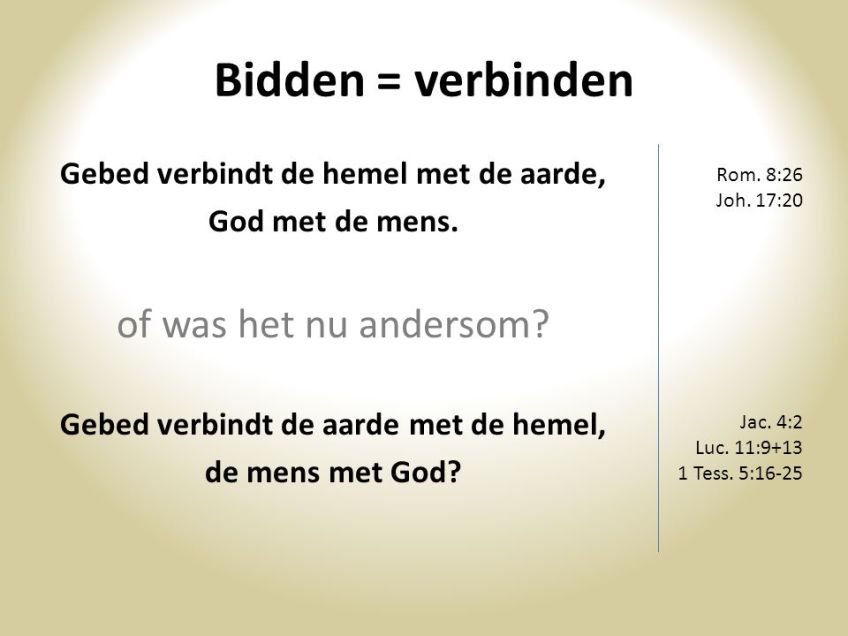 Gebed verbindt de hemel met de aarde, God met de mens. of was het nu andersom? Gebed verbindt de aarde met de hemel, de mens met God? Rom. 8:26. Joh. 17:20. Jac. 4:2. Luc. 11: Tess. 5:16-25.