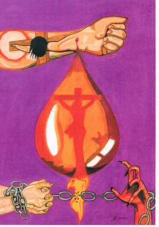 Een pasteltekening van John Astria die de gekruisigde arm van Christus weergeeft op een paarse achtergrond, teken van volmaaktheid. In de bloeddruppel zien we Christus op het kruis, die de losprijs betaalt voor de zonden van de mensheid. Alleen het bloed van Christus kan ons bevrijden van de ketting tussen Satan en de mens. Bij aankoop van deze geplastificeerde A3 prent zijn de verzendingskosten inbegrepen.