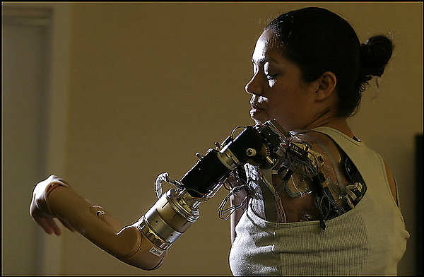 CAPTION: Claudia Mitchell, who lives in Ellicott City, is the first woman to be equipped with a bionic arm. She can think to make it move. She is pictured in a Marriot hotel room where she was giving interviews before her debut tomorrow at a press conference.