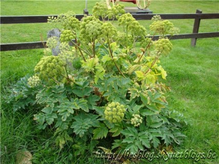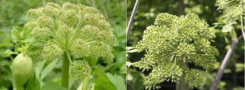 grote engelwortel – scherm tot 20 cm breed, 20 tot 40 stralen – bloemen zijn 3 tot 4 mm, groenachtig wit – plant lichtgroen, bij kneuzing sterk ruikend – eindblaadjes vaak 3-delig met aflopende voet – tot 2,5 meter hoog – wortelbladeren met rolronde stengel |