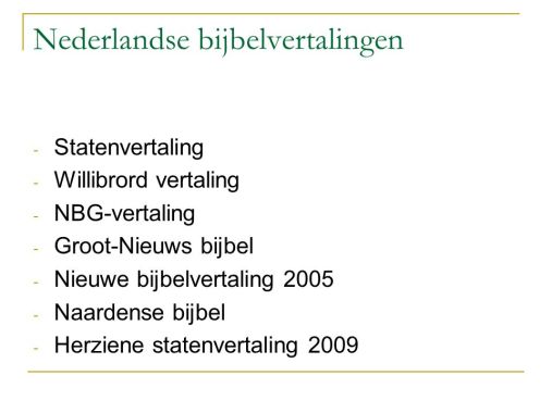 Dat zie je bijvoorbeeld in de Bijbel in Gewone Taal (BGT) waar je leest wat de vertaler denkt dat de schrijver bedoelde. Wie dus de Bijbel zelf wil bestuderen doet er goed aan uiteindelijk terug te grijpen op een meer tradi-tionele vertaling. Daarin kun je veel beter weerklanken herkennen, die essentieel zijn om de Schrift te leren be-grijpen. Voorbeelden van zulke studiebijbels zijn de NBG vertaling van 1951, de Herziene Statenvertaling, en in iets mindere mate de Nieuwe Bijbelvertaling (NBV) die in oktober 2004 uitkwam.