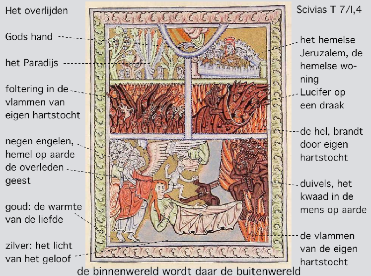 Het menselijke lichaam is als het ware een afspiegeling van de geschapen wereld als geheel, het universum. In haar visioen zag Hildegard de mensengestalte staande in het midden van de cirkels der elementen. Zoals de armen en benen het lichaam van de mens in evenwicht houden temidden van alle natuurkrachten, zo houdt de ziel het innerlijk van de mens in evenwicht.
