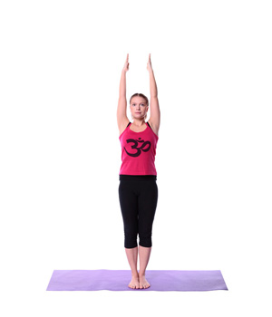 - Til de armen langszij op, breng handen boven het hoofd samen met de vingers in elkaar. Draai de palmen naar boven en strek naar boven alsof je de hemel draagt. Tegelijkertijd de hielen optillen.