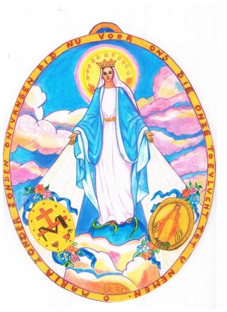 Zaterdag 27 november. Het is half 6 en de zusters zitten in de kapel om te mediteren. Catherine hoort het geruis van een kleed en weet direct dat het de Heilige Maagd is. De Maagd blijft staan op de hoogte van het schilderij van St Jozef. Maria ‘staande in de ruimte’ draagt een rood, lichtgevend gewaad. In haar handen heeft ze een gouden bol met een kruis erop. Zelf staat ze nog op een grotere halve bol. Het is alsof ze de kleine bol (de wereld) God aanbiedt, terwijl haar ogen hemelwaarts gericht genade afsmeken.